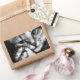 Fotografia branca e preta de um gato com olhos verdes abraçando um gatinho adorável.