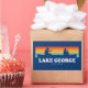 Conhecido como a Rainha dos Lagos Americanos com suas mais de 109 milhas de costa e mais de 300 ilhas, o Lago George é um paraíso de férias que oferece esportes aquáticos intermináveis, caminhadas, ciclismo e aventuras ao ar livre. Este design de colheita tem cores retrógradas com árvores e um arco-íris.