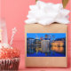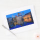 Um autocolante de fotos retangular da linha do horizonte da cidade de Haia, o centro governo dos Países Baixos, no início da noite em Blue Hour, com os arranha-céus da arquitetura moderna por trás do histórico museu Mauritshuis, Binnenhuns do prédio do parlamento e do lago Hofvijver.