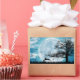 Imagem de uma grande lua azul de cheio com nuvens e estrelas ao fundo. No primeiro plano, as silhuetas de grama, uma árvore, borboletas e um coelho saltando.