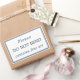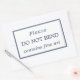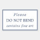 Etiqueta de expedição para as artes plásticas que diz "por favor, não dobre contém arte fina" em azul marinho contra branco. Bordas azuis de marinho ao redor do texto. Uma design simples e clara.