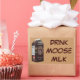 Uma caixa de leite de uma fazenda leiteira mundial famosa e inteiramente mítica de Matanuska Moose milk no Alaska; não muito longe de Anchorage. O slogan "Beba leite de alce" também é exibido. A imagem do logótipo apresenta uma ordenha manual leiteira Matilda, a primeira alça leiteira de fazenda. Acreditem ou não que há fábricas de alce; um pequeno número na Rússia e um na Suecia. O leite de alce é cultivado comercialmente na Rússia. Um vitelo de alce de nascer fazenda é retirado da mãe nas 2 a 3 horas seguintes ao nascimento e é criado por pessoas. É primeiro alimentado a garrafa com um substituto do leite, e depois alimentado a partir de um balde. Os animais imprimem e tornam-se ligados aos seres humanos. O leite é rico em gordura-butírica (10%) e sólidos (21,5%), segundo dados coletados sobre a alce russa; a pesquisa sobre o leite-alce americano está em estado menos avançado do que na Rússia, mas parece indicar que a alça americana tem até concentrações mais alto de sólidos no leite. Diz-se que o leite de alce é um pouco salgado e amargo, com uma sugestão de agulhas de pinho ou de pinto. O leite de alce é cultivado comercialmente na Rússia. Um vitelo de alce de nascer fazenda é retirado da mãe nas 2 a 3 horas seguintes ao nascimento e é criado por pessoas. É primeiro alimentado a garrafa com um substituto do leite, e depois alimentado a partir de um balde. Os animais imprimem e tornam-se ligados aos seres humanos. Tal como acontece com os bovinos leiteiros, os vitelos são retirados das suas mães após um curto período de tempo. Os russos dizem que as alças reconhecem rapidamente as leiteiras como substitutas como seus vitelos substitutos. Nesse ponto são liberados para a floresta, mas visitam a fazenda todos os dias para serem ordenhados durante o período de lactação (normalmente até setembro ou outubro). Durante o inverno, os animais vagueiam por toda a floresta circundante. Mas geralmente não se afastam muito, mas passam muito tempo em matas próximas, onde as árvores são cortadas, alimentando-se de subprodutos de operações madeireiras. E eles conhecem a fazenda como o lugar para rações diárias de aveia, e como um lugar seguro para dar à luz a sua juventude. Um sanatório russo serve leite alado aos residentes, acreditando que ajuda a se recuperar da doença ou a administrar doenças crônicas de forma mais eficaz. Alguns investigadores russos recomendaram que o leite de alce pudesse ser utilizado para a prevenção de doenças gastroenterológicas em crianças. A fazenda Elk (Moose são chamados Elk in Europe) House (Älgens Hus), em Bjurholm, considera-se que a Suecia é o único produtor mundial de queijo alce. O queijo vende cerca de 500 dólares por libra. O restaurante de Algens Hus oferece pratos de queijo alce. Queijo comum com pão ou biscoitos, ou melhor ainda, musse de alce congelado. Melhor servido com framboesas.