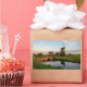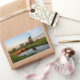 Um autocolante de fotografia retangular de um moinho de vento próximo a uma pequena vala com uma ponte na borda de um grande campo no campo holandês ao pôr do sol em Aarlanderveen, Países Baixos.
