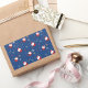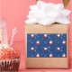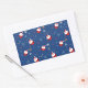 Padrão sem costura com Papai Noel e flocos de neve sobre fundo azul, estilo de desenho animado. As Santas são gordinhas, com barbas brancas e ternos vermelhos com cintos pretos. Os flocos de neve têm formas e cores diferentes, incluindo branco, azul e laranja. A palavra "Feliz Natal" está espalhada por todo o padrão em letras pequenas. O padrão é festivo e alegre, perfeito para o feriado. Arte digital.
