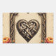 O batimento cardíaco dos deuses antigos: Um quadro mágico celta. Um quadro de inspiração Celta, ornamentado, com padrões de nó complexos em tons dourados e castanhos. Um ornamento em forma de espada com um nó está localizado no topo, e um nó em forma de coração está localizado no fundo, flanqueado por laranja e flores vermelhas vibrantes. A design combina tradição, força e vitalidade.