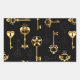 Padrão perfeito de chaves antigas, douradas e silhuetas em fundo preto.