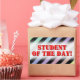 Esse design apresenta um padrão de listras coloridas de várias cores pastéis de luz, com listras negras entre elas. Também apresenta a mensagem "ESTUDANTE DO DIA!".