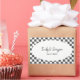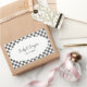 Decorate wedding party favors with these personalized stickers. They feature your names and your wedding date in black lettering in a white oval frame that's set against a painted checkerboard pattern of painted black squares and plain white squares.