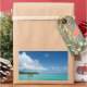 Um autocolante retangular com uma pequena ilha com palmeira na lagoa turquesa da ilha tropical Bora Bora perto do Tahiti, na Polinésia Francesa.