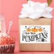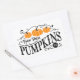 Este adorável adesivo de fazenda apresenta um letreiro de abóbora que diz "Abóboras frescas de Fazenda" em uma fonte decorativa.