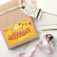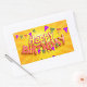 Texto feliz de aniversário em negrito e divertido, com cores roxas e laranja cercadas por decorações coloridas definidas sobre um fundo amarelo brilhante.