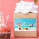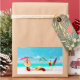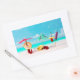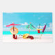 Três pimentões vermelhos na praia. Dia ensolarado quente, mar azul, areia branca, guarda-chuvas e sombreros. Dois pimentos são sonolentos debaixo de guarda-chuvas de praia, o terceiro está caindo no fundo da água. Cada hora é uma hora feliz na praia. Sol, Mar, Areia, Sombrero. Produtos e lembranças horizontais e orientados para a paisagem