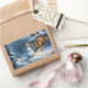 Uma agradável, colorida pintura de inverno de um boneco de neve fora de uma casa.