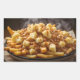 Um prato de Poutine com batatas fritas, queijo cottage e molho.