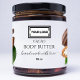 Rótulo de manteiga corporal com foto de cacau com adição de sua opção de logotipo com caligrafia elegante. Rótulo de produto preto e branco perfeito para o negócio de manteiga de corpo caseiro.