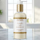 Esta elegante etiqueta de produto para garrafas cosméticas apresenta um fundo branco com uma falsa borda de ouro. Esta etiqueta contém espaço para o nome do seu produto, nome comercial, peso do produto, ingredientes, instruções, mídia social e endereço comercial. Este rótulo mede 4,5 polegadas por 2,7 polegadas e está disponível em acabamento brilhante ou fosco.