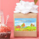 Um adesivo alegre para a época do outono, com um celeiro vermelho, com uma mancha de abóbora pronta para decoração de outono, e as folhas estão mudando de cor nas árvores, desenhadas a tinta com aquarela. Maneira divertida de compartilhar saudações de outono!