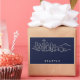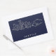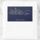Esta design apresenta um esboço desenhado manualmente do horizonte de Seattle sobre um fundo azul escuro.