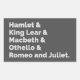 Um design atemporal, perfeito para quem ama literatura inglesa! "Hamlet e Rei Lear e Macbeth e Othello e Romeu e Julieta" Shakespeare toca em cinza. Literatura vitoriana. Realce seu estilo e espaço com esta arte.
