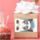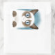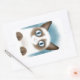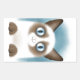 Gato siamês sorridente, de olhos azuis, com fundo azul.