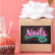 Unhas neonatais em uma parede de tijolos, perfeita para adição de talento e decoração em qualquer salão de cabelo e prego.