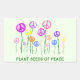 Uma design colorida de símbolo de paz "flores" crescendo em um jardim, com a mensagem "Plantar sementes de paz". Se querem ajudar a promover a paz no mundo, mostrem-no como um lembrete gentil para todos nós que atuamos de forma a fomentar a paz.