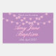 AS LUZES DE CORDA PINTAM OS PINTOS DE BAPTISMO QUE CRISTAM OS PEDAÇOS RETANGULARES. Este batismo bonito, rústico, batizando ou primeiro adesivo de comunhão apresenta luzes de cordas cor-de-rosa e uma bela caligrafia branca com sombra rosa. Personalize com seu próprio nome, data e mensagem do bebê. Projetado por Piglet © Pura em www.zazzle.com/purepiglet*.
