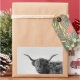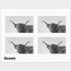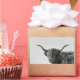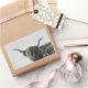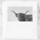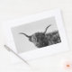 Um adesivo fotográfico retangular com uma vaca escocesa Higland resistente, mas engraçada, com chifres grandes, pêlos longos à frente dos olhos e a boca meio aberta em preto e branco / monocromático.
