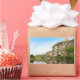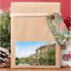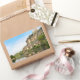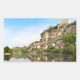 Um autocolante retangular de fotografia do castelo e da aldeia de Beynac-et-Cazenac construída sobre os penhascos ao lado do rio Dordogne, no início da manhã, com reflexo no rio e um caiaque no primeiro plano. A cidade está situada no perigor, na França.