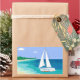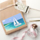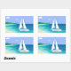 Monogramas Sailboat Costal Tropical Beach Stickers. Um veleiro com seu nome, se aproximando de uma praia. Vista do mar tropical. Azul, lacrimejo, espuma marinha, turquesa, verde, branco.