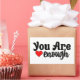 Encaixe-se em autoafirmação e infunda seu entorno com vibrações positivas usando esta maravilhosa tipografia "Você é suficiente" com adesivo de Coração Vermelho. Meticulosamente criado para elevar seus espíritos, este adesivo apresenta um design de tipografia encantadora acoplada a um coração vermelho vibrante. Sua versátil construção leve permite decorar com facilidade uma grande variedade de objetos, como capas de telefone, revistas ou espelhos. Ao simplesmente aplicar este autocolante sincero, você será lembrado de que você realmente merece, valoriza, e mais do que o suficiente, fazer-o como um presente ou item pessoal ideal para aumentar a autoconfiança e espalhar o amor.