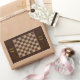 Este adesivo apresenta o efeito de um rico folheado de madeira escura com um conselho de oito por oito quadrados de marrom decorado alternado e azulejos de creme representando os quadrados escuros e claros de um tabuleiro de xadrez, conselhos de rascunho ou conselhos de damas. Use o botão Personalizar para personalizar o design. Escolha uma forma de adesivo diferente, se quiser. Um presente ideal para jogadores de xadrez ou para jogadores de outros jogos de conselho, como os Checkers (Projetos em inglês). Os professores e outras peças de jogo não estão incluídos.
