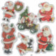 These are a collection of vintage-style die-cut Christmas stickers featuring various depictions of Santa Claus. The six distinct designs show Santa in different poses and situations, including one holding a wreath, another running, one driving an old-fashioned car with a Christmas tree and gifts, one waving cheerfully, one holding a small black poodle on a pillow while wearing an elf-like hat, and a final one standing with a large green sack of toys. All the Santas are dressed in their classic red and white fur-trimmed suits, giving the set a charming, nostalgic holiday look.