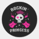 Um design bonito apresenta um crânio com olhos em forma de coração e duas guitarras elétricas cruzadas, e a citação "Princesa Rockin'".