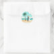 Inclui 20 adesivos pequenos em uma folha. Adorável ilustração de um casal vestido de noivos compartilhando um momento romântico em uma praia arenosa com uma palmeira e oceano azul claro ao fundo.
