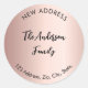 Mudamos, devolva o adesivo de endereço. Personalize e adicione seu nome de família, seu novo endereço. Texto curvo. Rosa dourado, fundo cor-de-rosa pincelado.