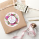 Saquetas personalizadas que dizem Fecho de mão com amor com um pouco de coração vermelho. Projetado com um buquê floral composto por rosas de rosa claro e papoilas cor-de-rosa escuras com muitas folhas verdes e peludas. Um quadro em camadas acima para colocar seu dentro de texto personalizado. O fundo é um padrão de listras rosa-macio.