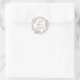 Um adesivo de favor bonito para um chá de fraldas Pequeno Milagre com a frase "pequeno milagre" na letra da caligrafia moderna e o verso Bíblia "para esta criança que rezamos" 1rua Samuel 1:27, rodeado por uma rosa rosa rosa e folhas verdes, coroa aquática