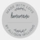 Rótulo cinza suave Feito Com Amor adesivo de comida caseira com tipografia preto e um design de letra manuscrita. Perfeito para selar produtos assados, potes de geleia, biscoitos, pão, caixas de torta, embalagens de pequenos negócios, lembrancinhas de festa e presentes artesanais. Possui uma linha de nome personalizável, tornando-o ideal para padeiros caseiros, artesãos e pequenas marcas que buscam um acabamento limpo e discreto.