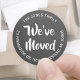 Adicione um toque elegante de fim à mudança de cartões de endereço, novos anúncios de endereço e outra correspondência com esses adesivos Nós movemos / Eu movi os adesivos redondos. Todo texto pode ser personalizado. O design preto e branco apresenta a caligrafia do script de manuscrito na moda, fundo do quadro, nome e endereço personalizados em um círculo. Estas etiquetas são uma forma moderna e chique de apresentar amigos e familiares à sua nova casa. Design simples e minimalista adiciona estilo sofisticado aos convites de festas de aquecimento doméstico, mudamos / movemos anúncios, cartões de natal para amigos e família, casamento, chá de panela ou graduação, obrigado notas, etc.