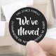 Adicione um toque elegante para trocar cartões de endereço, novos anúncios de endereço e outra correspondência com esses adesivos Nós movemos / movi-me. Todo texto pode ser personalizado. O design preto e branco apresenta a caligrafia do script de manuscrito na moda e o nome e endereço personalizados em um círculo. Essas etiquetas são uma maneira moderna de apresentar amigos e família à sua nova casa. Design simples e minimalista adiciona estilo sofisticado aos convites de festas de aquecimento doméstico, mudamos / movemos anúncios, cartões de natal para amigos e família, casamento, chá de panela ou graduação, obrigado notas, etc.