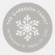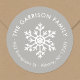 Barato impresso com etiquetas de endereço redondo impresso personalizadas com o nome da sua família e o endereço de retorno. Este simples design de Natal moderno apresenta um floco de neve branco sobre um fundo de cinza de luz neutra. Use as ferramentas de design para escolher qualquer cor de fundo, editar fontes de texto e cores ou carregar suas próprias fotos para design suas próprias etiquetas de endereço de retorno de feriado, selos de envelope ou adesivos de etiqueta de presente.