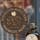 Edite seu nome comercial, endereço, volume de xarope de bordo e nível. Folha Dourada de açúcar com aranha Maple, escrita em texto metálico de ouro e uma simples borda. Fundo castanho.