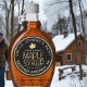 Adicione o seu nome comercial, endereço, volume de xarope e xarope de bordo. Rótulo preto e dourado casual, mas clássico. Folha de açúcar com um gradiente de ouro metálico. As palavras "Maple" e "Syrup" são apresentadas em letra manuscrita com um gradiente colorido de xarope de bordo com água para a boca.