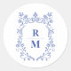 Etiqueta elegante com uma crista floral azul. Fácil de editar com suas iniciais.