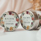 Coloque o seu convite em envelopes ou favores com estes elegantes adesivos florais de casamento que contêm os seus nomes enquadrados por uma coroa de rosas e mães de aquarelas em ricos tons de outono de burgundy, marsala, rosa-pincel e marfim, com folhas verdes escuras e folhagem. Projetado para coordenar com a nossa coleção de casamentos florais Rustic Bloom para outono ou casamentos no inverno.