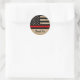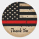 Linha Vermelha Thin Obrigado Stickers - design de bandeira americana em cores de bandeira de bombeiro, design angustiado sobre fundo de madeira rústica Este obrigado de bombeiro que você cola é perfeito para adicionar o toque final a presentes e favores na graduação de bombeiros ou festas de aposentadoria e departamentos de bombeiros. COPYRIGHT © 2020 Judy Burrows, Black Dog Art - Todos Os Direitos Reservados. Bombeiro Rustic Thin Red Flag Obrigado Coletor Clássico Round Sticker