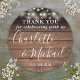 Um roteiro de assinatura rustica favorece o obrigado, seu adesivo redondo clássico, com luzes bonito de cordas e nomes de estilo de assinatura em um fundo de painéis de madeira. Personalize com seu obrigado especial suas informações em tipografia branca-chic. Projetado por Thisnotme©