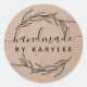 Adesivo redondo rústico com folha de louro, caligrafia "feito à mão" com tipografia moderna.