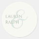 Este pequeno e elegante adesivo apresenta um conjunto contemporâneo de fontes e elementos de script em verde-sábio, contra um fundo de marfim cremoso. Faz parte de uma coleção de casamento que inclui um cheio de papéis de carta de casamento e favores.